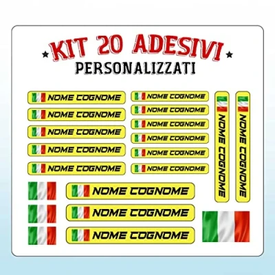 20 etichette adesive impermeabili di diverse dimensioni. Possibilità di personalizzare: NOME - BANDIERA - COLORE SFONDO - COLORE CARATTERE L'adesivo deve essere posizionato su una superficie pulita e liscia. Adatto per vetro, metallo, legno, porcellana, plastica, ecc. Prodotto rigorosamente MADE IN ITALY