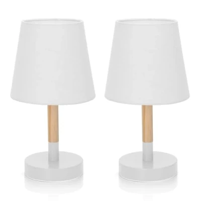 Aigostar 2 Pezzi Lampada da Tavolo, Piccola Comodino in Legno, Scrivania con Paralume Tessuto Bianco e Base Metallo, Portalampada E14, Vintage per Camera, Soggiorno
