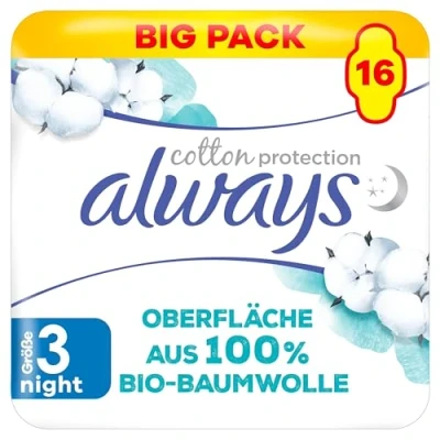 Always Cotton Protection Ultra Night Assorbenti igienici con ali X16, superficie in 100% cotone biologico