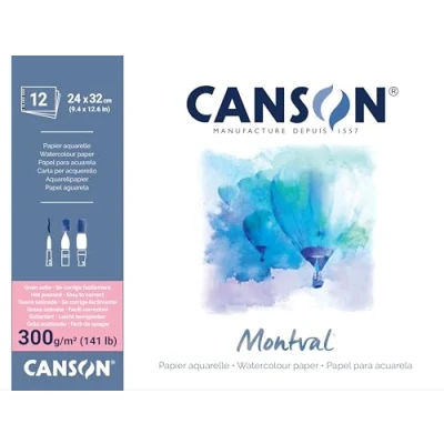 Canson Montval, Blocco da Disegno per Acquerello, Guazzo, Acrilico, 24x32 cm 300 gm, Grana Satinata,12 Fogli, Collato un Lato