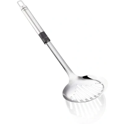 - combinazione di elegante acciaio inossidabile e plastica nera - la comoda impugnatura si adatta perfettamente alla mano - drena efficacemente l'acqua in eccesso - facile prelievo e posizionamento dei cibi preparati - foro per essere appeso a un gancio - lavabile in lavastoviglie - 2 anni di garanzia Il cucchiaio per schiumare Leifheit ProLine vi aiuterà a rimuovere rapidamente l'acqua in eccesso anche quando servite i piatti pronti. Questo modello combina un acciaio inossidabile estremamente elegante con inserti di plastica nera di buon gusto. Il manico del cucchiaio è arrotondato e si adatta perfettamente alla mano. L'uso di questo accessorio è molto confortevole. La punta è dotata di fori per lo scarico dell'acqua e di un bordo leggermente rialzato per evitare che il contenuto trasportato scivoli via. La lunghezza del cucchiaio colino ProLine di Leifheit è di 37,5 cm. La punta larga 11 cm consente di raccogliere e servire comodamente i cibi preparati. Questo modello è perfetto per la pasta, gli gnocchi, i canederli della Slesia o gli gnocchi. Con il cucchiaio, le prelibatezze preparate vengono comodamente disposte sul piatto. La sua forma estetica è ideale per uno stile moderno o minimalista. Farà un figurone sulla tavola durante una cena in famiglia o un incontro sociale. È dotato di un foro per essere appeso a un gancio. Il cucchiaio ha una garanzia di 2 anni.