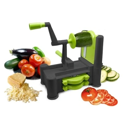Tritatutto 3 in 1. Viene fornito con tre diverse lame e una sezione portaoggetti. Viene fornito con tre diverse lame, una per il taglio della ghirlanda e un'altra per strisce, come gli spaghetti. Modo d'uso: 1) Spingere verso il basso la base di aspirazione su una superficie piana e liscia. 2) Scegliere e inserire la lama desiderata. 3) Conservare le lame rimanenti. 4) Tagliare una sezione del prodotto alimentare e fissare la superficie di lavoro piana al supporto alimentare. 5) Posizionare sempre il cibo al centro. 6) Spingere la maniglia in avanti mentre si gira l'altra maniglia verso sinistra. Prepara i tuoi piatti originali più rapidamente, più semplice manipolazione manuale, tagliando frutta e verdura più soda. Risparmia tempo e prepara deliziosi piatti con questo assistente in cucina. Strumento da cucina ideale per uso domestico.