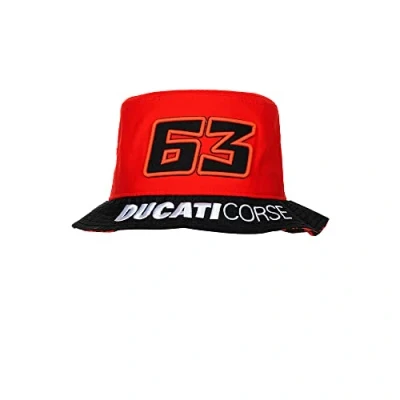 Cappellino appartenente alla collezione Ducati di Francesco Bagnaia Il modello è di tipo pescatore ed è realizzato in cotone Sulla parte frontale è ricamato il numero 63 con cui Pecco corre in MotoGP Sulla parte posteriore la scritta DUCATI CORSE e lo scudetto Ducati.